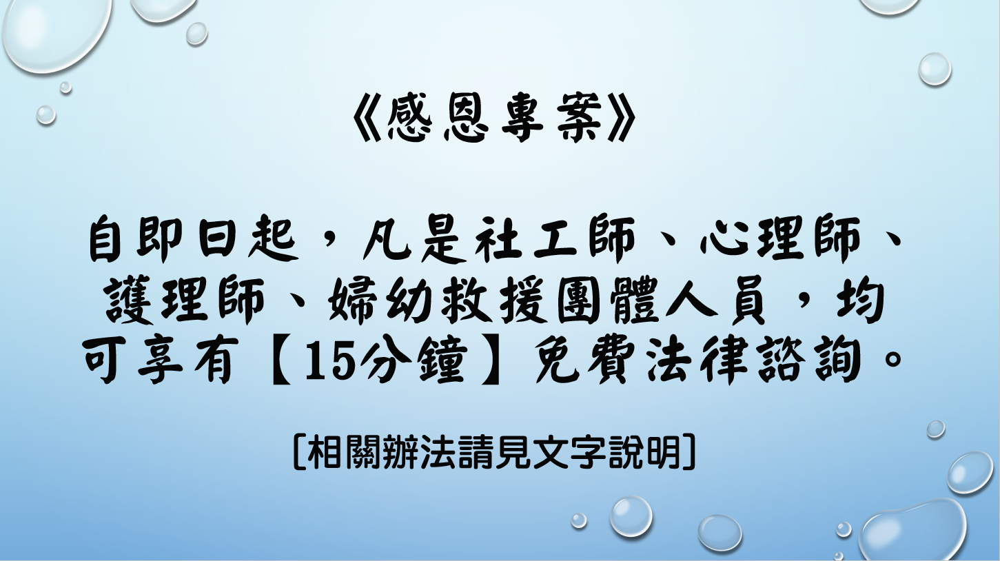 凡是社工師、心理師、護理師、婦幼救援團體人員來粉絲頁按讚,並加我的「三色書房之友LINE官方帳號」(LINE Id: @hongyi3c )的朋友就可以享有【15分鐘】免費法律諮詢(「各類法律問題」都可以)。